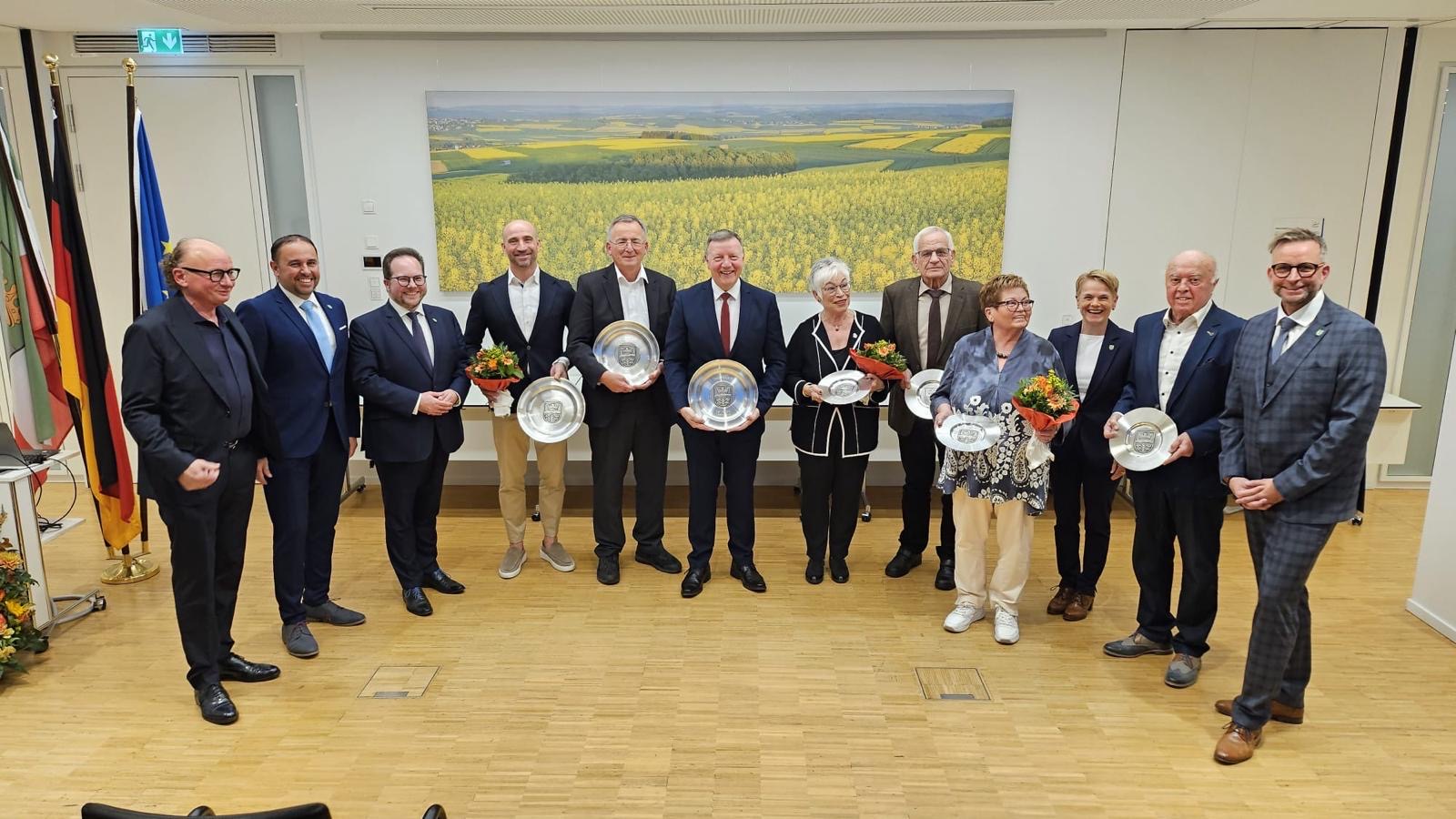CDU-Landtagsabgeordneter Peter Moskopp gratuliert zur Auszeichnung mit dem Wappenteller des Landkreises Mayen-Koblenz und dankt für ehrenamtliches Engagement